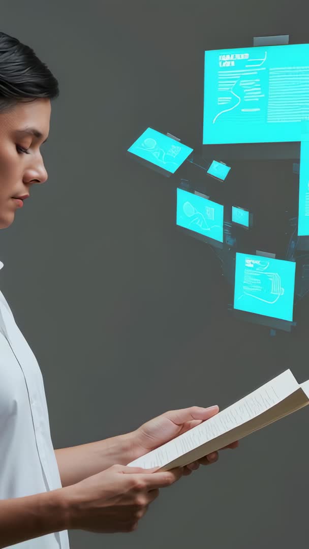 AI Generated Video. Vertical video showing woman reading book while holographic cyan interface panels floating to right, creating futuristic minimalist composition. Close-up side profile capturing focused expression and hands holding open book, emphasizing concentration and quiet study. Visual language blending analog reading with digital AR panels, suggesting future of learning and research and UX concept testing. Ideal for tech promo, e-learning module, UX demo reel, corporate training clip, app tutorial, social media vertical ad, website hero or presentation opener. Editing suggestions: pairing with subtle ambient soundtrack, adding animated text overlays and lower-third captions, using slow parallax reveal for panels, color grading to reinforce cool cyan tones.