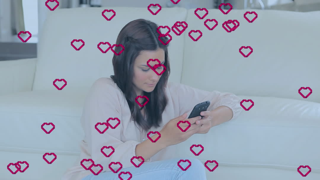 Young caucasian woman sitting on a couch, engaged with social media through her smartphone. Digital hearts overlay representing notifications of likes and engagement with her online activities. Ideal for illustrating themes of social media interaction, technology dependency, and online social engagement in contemporary society. Useful for digital communication or marketing purposes.
