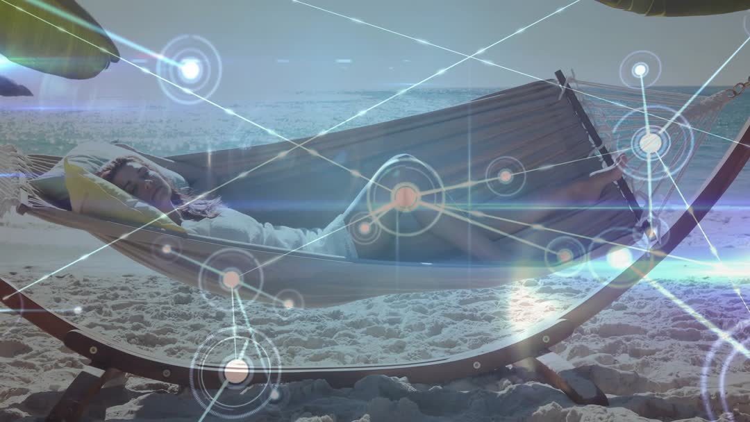 - Woman Reclining on Hammock While Digital Network Nodes Sweeping Across Sunlit Beach Horizon