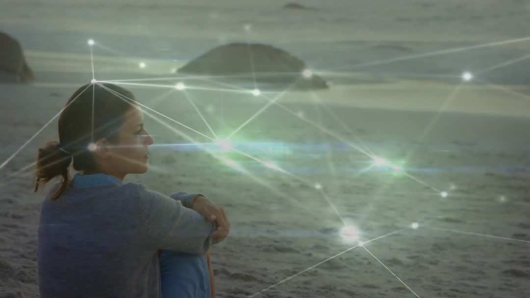 This depicts a solitary woman sitting on a beach as digital network connections overlay the scene. Perfect for illustrating concepts around technological innovation meeting nature. The juxtaposition of ocean serenity with technological networking can symbolize tranquil thought processing, futuristic communication, virtual networking in a natural setting, and connecting people through technology. It is ideal for articles or presentations pertaining to digital connectivity, remote work environments, or tech innovations influencing natural engagement.