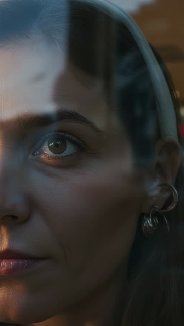AI Generated Video. Video showing woman gazing through car window while city lights pass across glass and reflections shift over face. Close-up framing capturing brown eye, hoop earrings catching light, skin texture adding realism and intimate mood. Working well for social media vertical ads, cinematic intros, beauty and jewelry campaigns, emotional storytelling, and editorial pieces about commuting and personal reflection. Providing copy space on right side for text and graphics, allowing easy integration into marketing, blog headers, vertical reels, and video transitions.