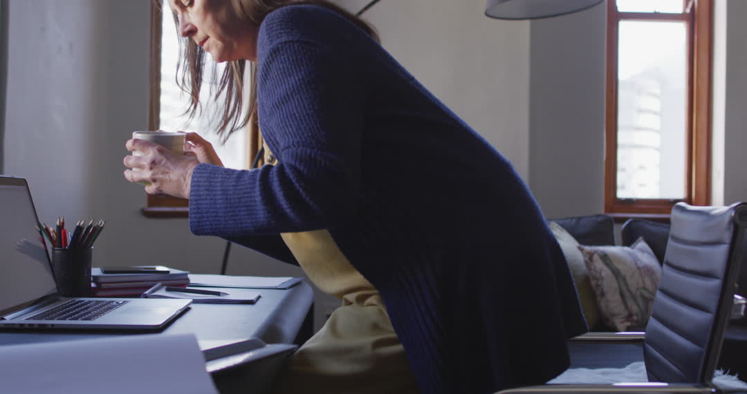 Woman sitting at a desk in a home setting, holding a cup of coffee. Ideal for concepts related to remote work, pandemic lockdowns, social distancing, and everyday lifestyle at home. Suitable for use in articles about work-life balance, working from home, or relaxation routines.
