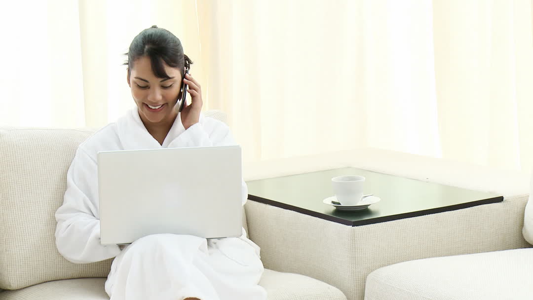 - Woman Relaxing at Home Using Laptop and Phone in Bathrobe