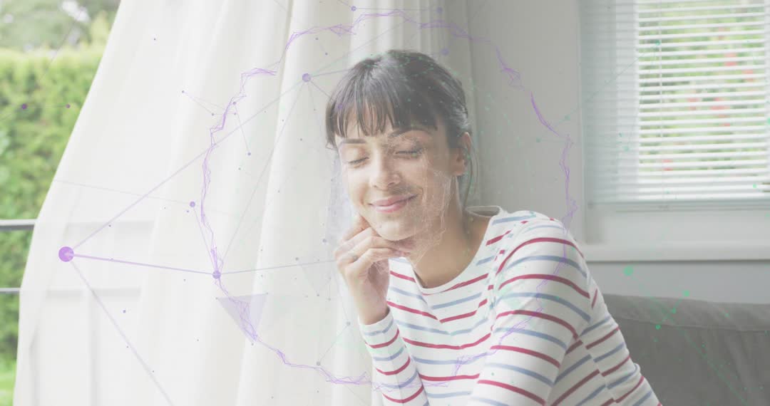 Woman Relaxing at Home with Digital Innovation Overlay Video