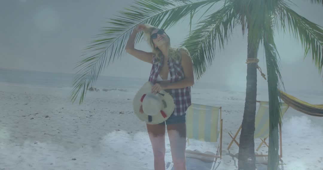 A woman in sunglasses is enjoying her vacation on a sunny tropical beach, standing under a palm tree while holding her hat. Ideal for travel advertisements, holiday brochures, or summer getaway promotions, this scene evokes a sense of relaxation and escape.