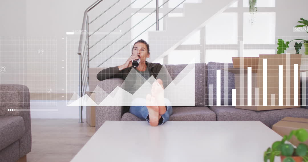The scenario depicts a woman sitting comfortably on a sofa in a contemporary living room while visual financial analytics are overlaid. This video is ideal for illustrating concepts of personal finance management, investment planning, or digital banking services. It can be used for lifestyle or finance-related articles, blogs about work-life balance in the financial sector, or marketing for tech finance applications.