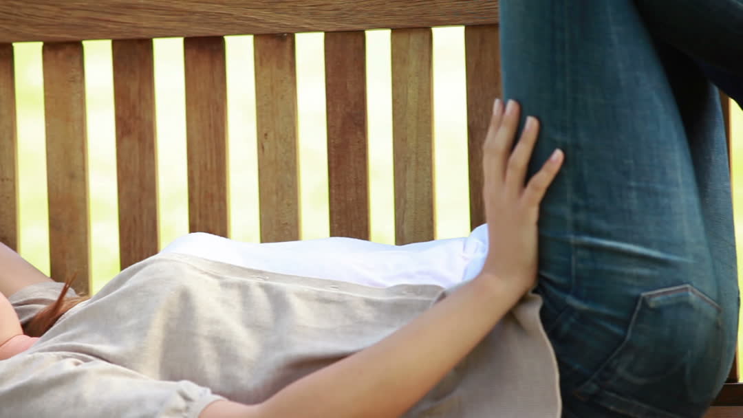 Scene depicts woman enjoying leisure time, listening to music while lying on park bench. Relaxing ambiance highlighted by wooden bench and natural setting. Ideal for depicting outdoor recreation, love of music, peaceful relaxation moments. Suitable for lifestyle content, urban park photography, headphone or music-related promotions.