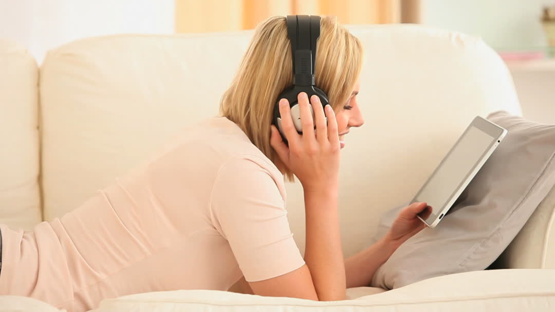 - Woman Relaxing with Tablet and Headphones on Sofa