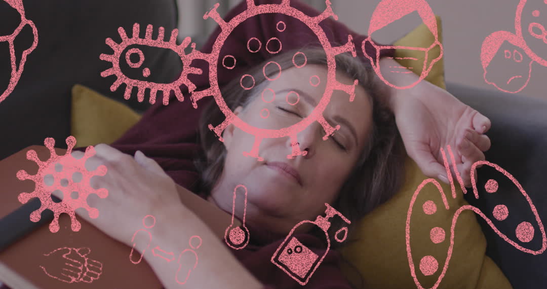 Woman is peacefully resting on couch with Covid-related symbols overlay. Symbolic representation mingling daily life and pandemic influence. Useful for articles on health awareness, Covid impacts on lifestyle, or public safety messages.