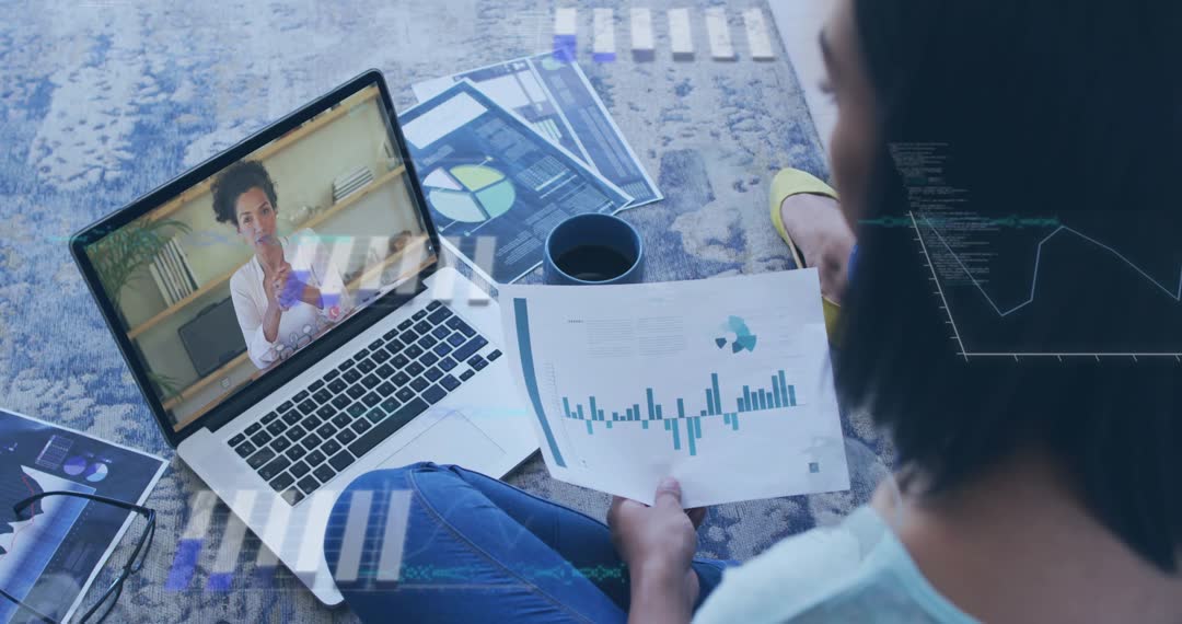 Scene showing woman holding bar chart while joining remote finance meeting on laptop. Colleague appearing on screen and waving, creating layered animated charts over report. Background including scattered printed charts, coffee mug, laptop, and living room floor. Visual style conveying modern remote collaboration, data analysis, and virtual presentation. Suitable for business presentations, corporate training, marketing campaigns, website banners, blog headers, social media posts, investor reports, finance tutorials, online course materials. Helpful for illustrating remote teamwork, virtual meetings, data-driven decision making, work from home productivity, consulting services, and hybrid office communication. Creative usage ideas: overlay company logo and lower thirds, add voiceover explaining analytics, crop for thumbnail or hero banner, pair with headline about digital transformation or remote finance strategy.