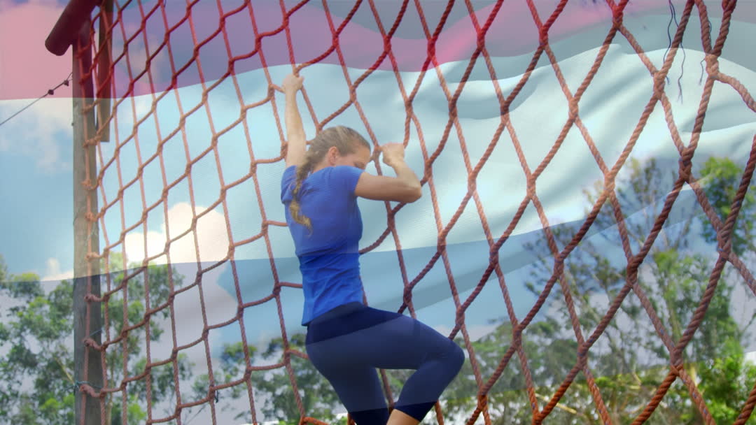 Young woman climbing a large rope net outdoors, showcasing athleticism and resolve. Vivid Dutch flag overlay conveys a sense of national pride intertwining sports performance. Suitable for themes of motivation, physical fitness, national sports events, and promotional content centered around healthy lifestyles.