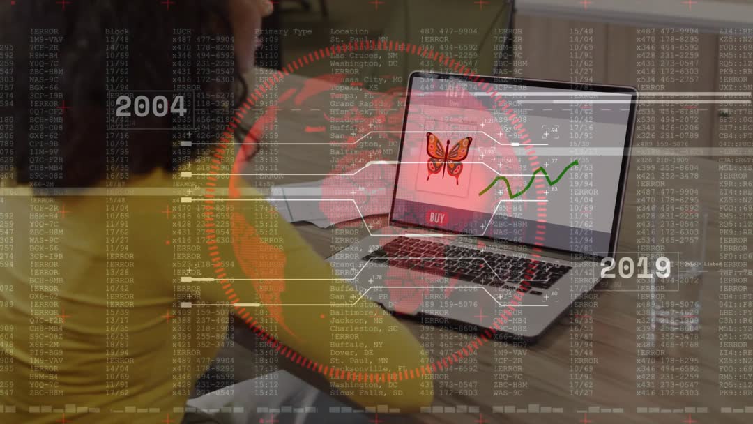 Woman Selecting Butterfly NFT on Laptop with Analytics Overlay Tracking Market Trend 2004-2019 Video