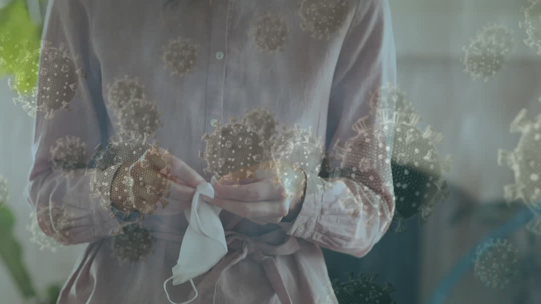 Woman Sewing Face Masks with Animated Covid-19 Cells Overlay Video