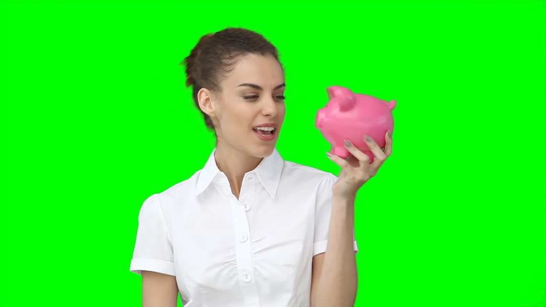- Woman Shaking Pink Piggy Bank with Green Screen Background
