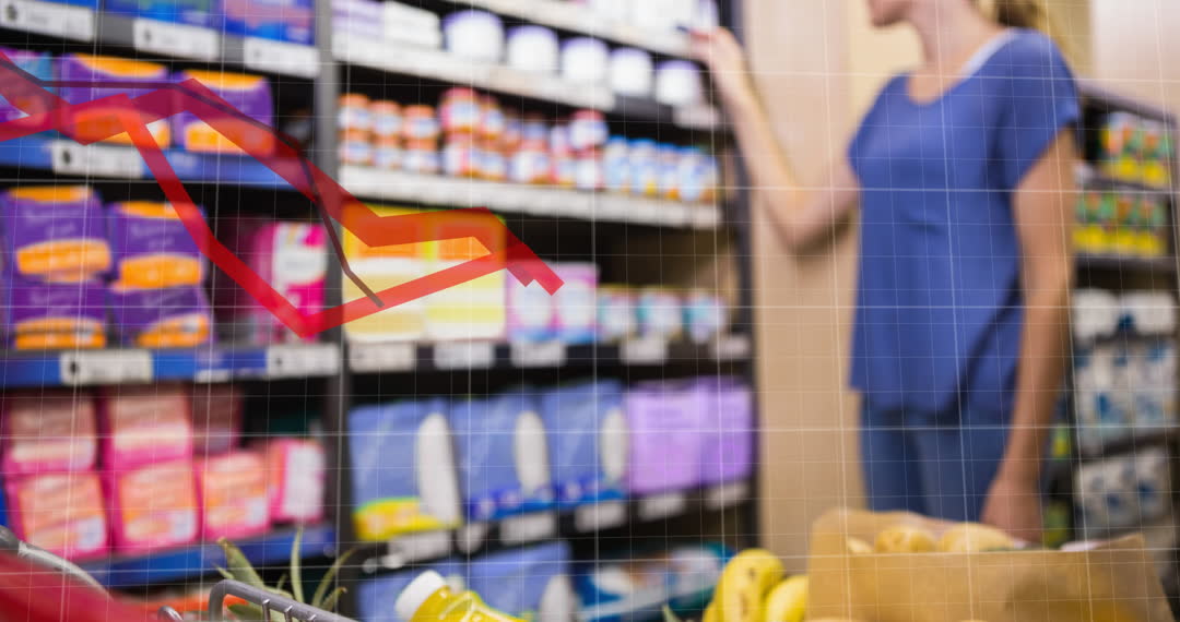 Image shows woman browsing in a grocery aisle with a shopping cart, overlaid with a graph indicative of economic or retail data analysis. The scene depicts a blend of daily activities and the impact of economic factors on consumerism. Useful for illustrating topics related to shopping behavior, market trends, economics, retail analysis, and technology in commerce. Ideal for blogs, articles, and presentations focused on the intersection of technology and retail.