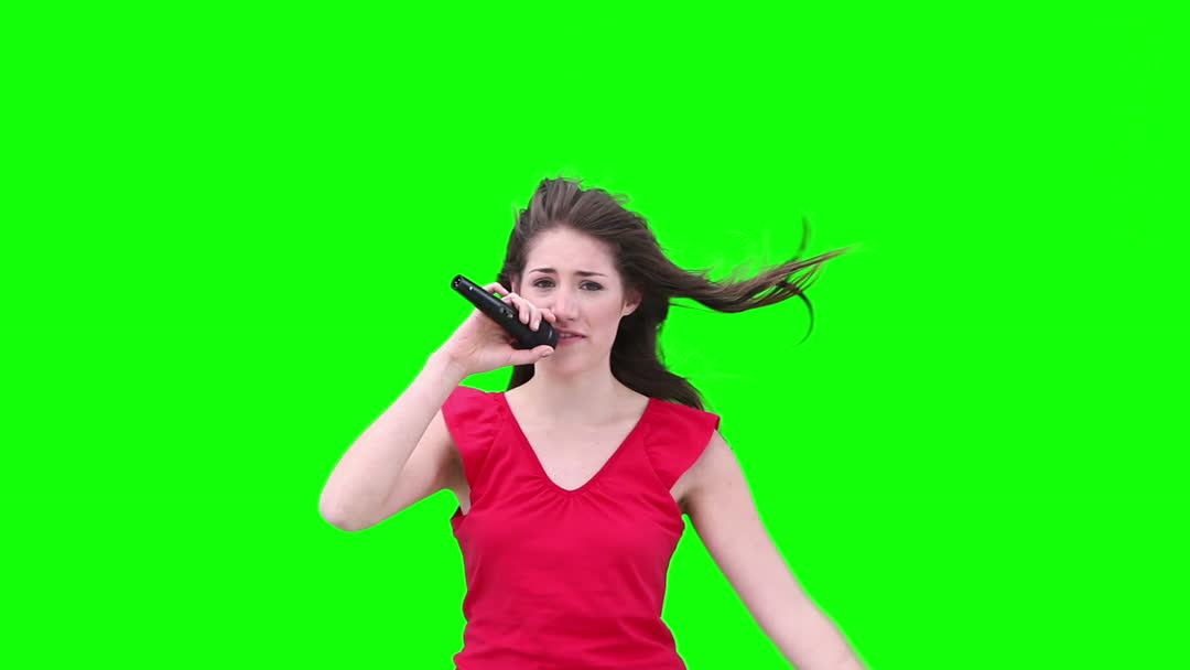 Vibrant portrayal of a woman singing into a microphone with wind-blown hair, set against a green background that is ideal for video editing and graphic design. Use as a background to express musical themes or performance arts in multimedia projects.