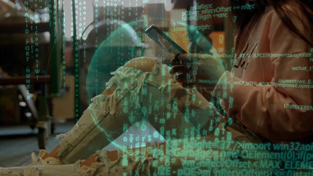 Video clip showing young woman sitting on floor tapping phone while holographic teal data sphere and streaming code overlaying foreground. Scene blending casual lifestyle with high-tech visuals, evoking augmented reality, data flow, cybersecurity themes. Serving as app promo, UI demo, cybersecurity explainer, startup pitch, social media ad, website hero, training module, or editorial segment on tech culture. Featuring color palette of teal and cyan with warm indoor tones, providing strong contrast for titles and lower thirds. Working well as b-roll, opener, looped background, or animated overlay when combining with motion graphics and voiceover. Offering phone screen replacement and compositing opportunities for showcasing app UI, login screens, analytics dashboards. Adjusting speed and loop points making clip flexible for short social spots or longer promo reels.