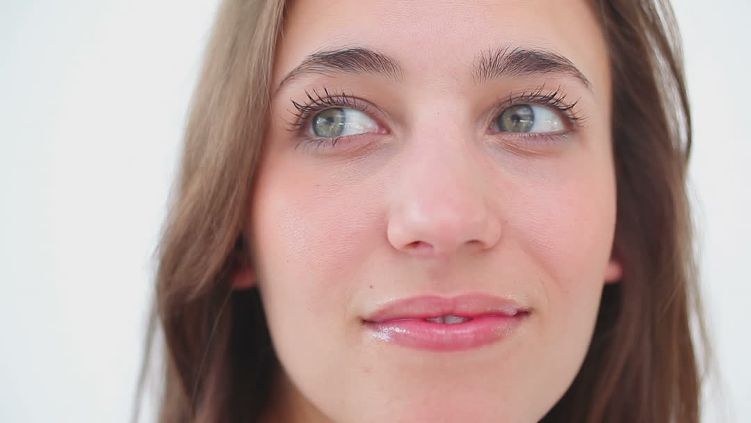 This video captures a young woman looking upwards with a gentle smile while her hair is brushed, set against a soft white background. Her clear skin and natural beauty make it ideal for use in promotional materials for personal care products, beauty advertisements, or health and wellness campaigns. The expression of contentment and positivity enhances its appeal for media focusing on lifestyle and personal well-being.