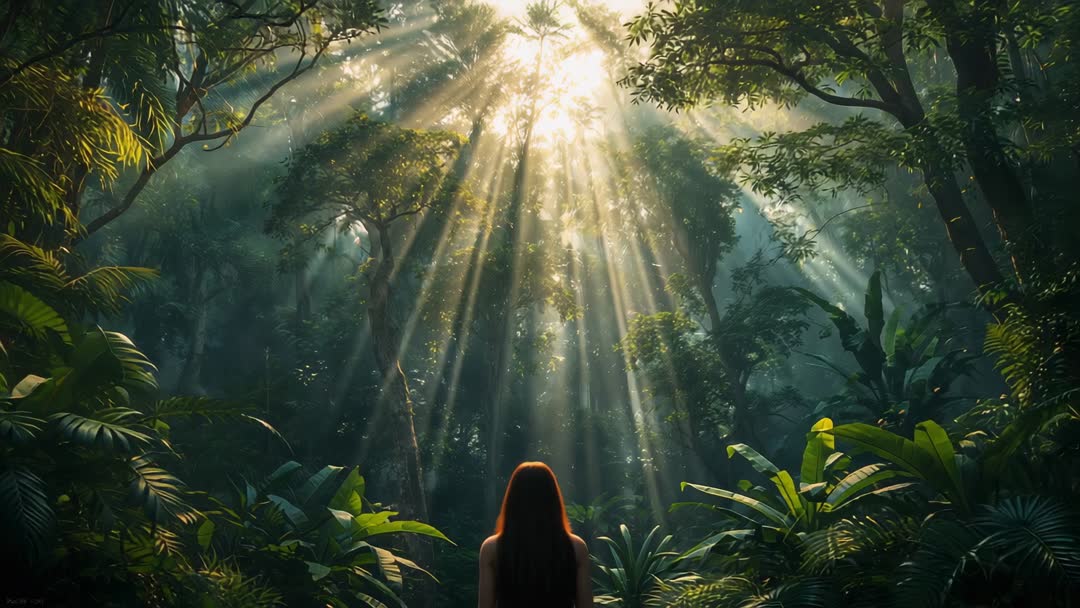 AI Generated Video. Scene showing woman standing at edge of rainforest clearing, watching sun shafts piercing mist through dense canopy, creating dramatic backlit silhouette and beams of golden light filtering through leaves. Composition emphasizing vertical light rays, lush tropical foliage, and soft atmospheric haze, evoking mood of wonder, solitude, and quiet reflection. AI-generated video frame delivering cinematic color grading and high-detail foliage for polished, filmic look. Ideal for use in travel and adventure video openers, wellness and meditation app backgrounds, environmental campaign spots, nature documentaries, book cover art, social media hero headers, cinematic title sequences, guided meditation videos, and brand storytelling assets. Working well as background for inspirational messaging, eco-tourism promotions, mindfulness marketing, or cinematic montage sequences requiring tranquil yet dramatic natural imagery.