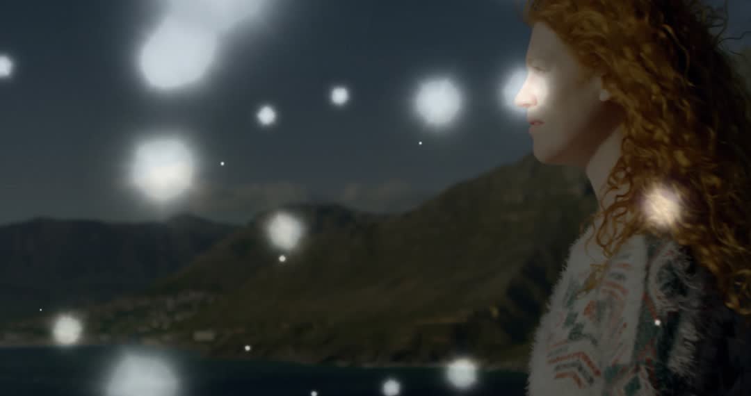 Woman Staring at Star-Lit Beach with Glowing Orbs in Ambience Video