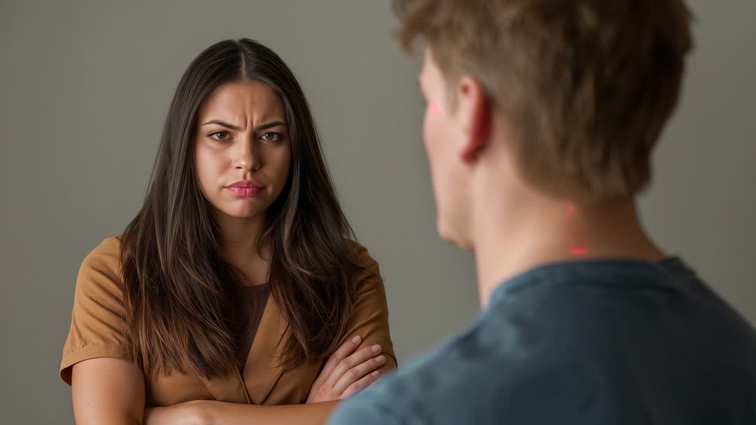 AI Generated Image. Video clip showing woman staring at man with arms crossed, facial expression conveying anger and frustration, red laser dot visible on man neck. Tight framing focusing on woman face and man profile, muted background directing attention to expressions and body language. Suitable for illustrating conflict, tension, confrontation, or heated discussion in editorial content, social media campaigns, and video thumbnails. Useful for training modules on communication skills, negotiation, anger management, HR conflict resolution, and counseling demonstrations. Working well for marketing on relationship advice, customer service disputes, workplace harassment awareness, or crime drama promotion. Editing suggestions include cropping for thumbnail, adding headline overlay on right, desaturating background or boosting contrast to heighten drama. Licensing suggestions include editorial and commercial use depending on model release.