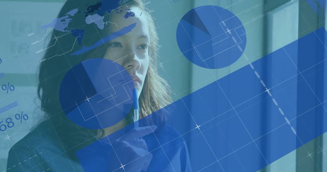 - Woman Strategizing with Overlay of Business Analytics and World Map