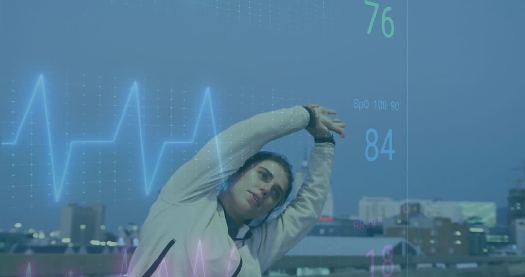 An athletic woman is stretching in an urban environment, with animated heart rate data overlayed on screen. This visual marries physical fitness with health monitoring technology. Ideal for use in articles or advertisements focusing on fitness, technological advancements in heart health monitoring, or sporty lifestyles. Suitable for clients or publications aiming to combine exercise with wellness technology themes.