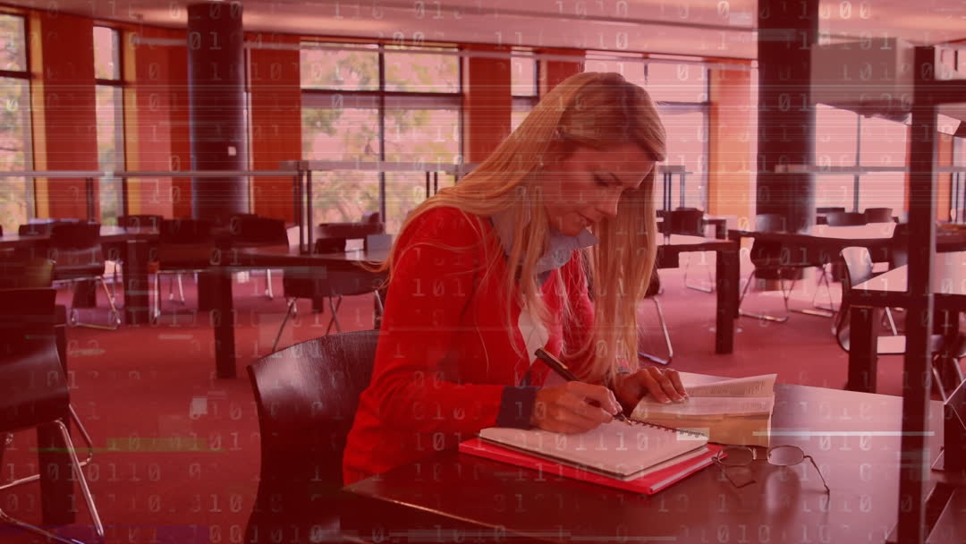 Woman Studying with Laptop and Books Amidst Digital Overlay Video