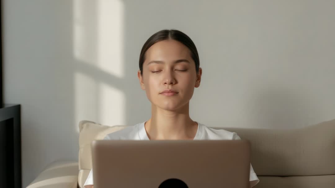AI Generated Image. Video showing young woman taking mindful break on couch with laptop open, closing eyes and breathing slowly while warm sunlight patch crosses face. Scene featuring neutral wall, soft natural light, laptop foreground and relaxed posture, conveying calm, focus and stress relief during remote work. Ideal for wellness and mental health content, work life balance articles, remote work guides, corporate wellness programs, guided meditation videos, social media ads, blog headers, website hero banners and app onboarding screens. Visual elements supporting promotion of digital detox, productivity tips, self care routines and employee wellbeing campaigns. Technical details including horizontal frame, shallow depth of field, muted color palette, casual clothing (white t-shirt) and natural window light. Stock video licensable for commercial and editorial use.