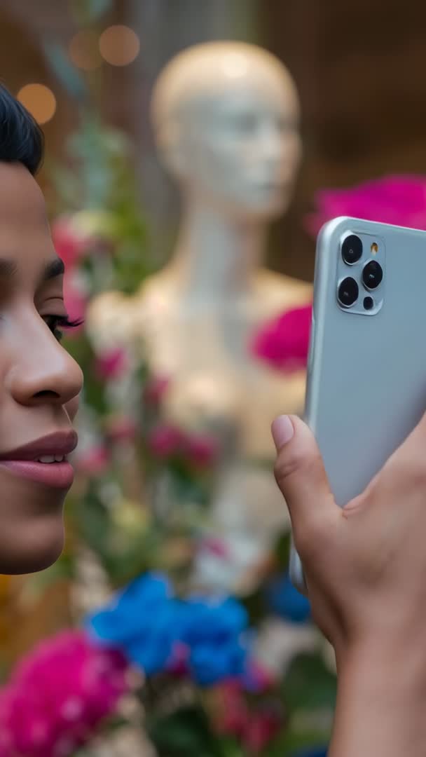 AI Generated Video. Close-up vertical video showing woman raising smartphone and smiling while taking selfie in front of boutique window display with mannequin and colorful flowers. Soft bokeh lights adding warm background glow and enhancing retail atmosphere. Suiting social media reels, influencer content, retail advertising, fashion lookbook, and smartphone camera demos. Leaving vertical composition and negative space for captions, logos, and call-to-action graphics. Usage ideas: using as opening shot for fashion reel, overlaying text for sale announcement, pairing with upbeat music for store promotion, demonstrating portrait mode and camera features in tech review. Vertical 9:16 aspect ratio, shallow depth of field, vibrant color accents, and natural lighting making clip ready for mobile-first campaigns.