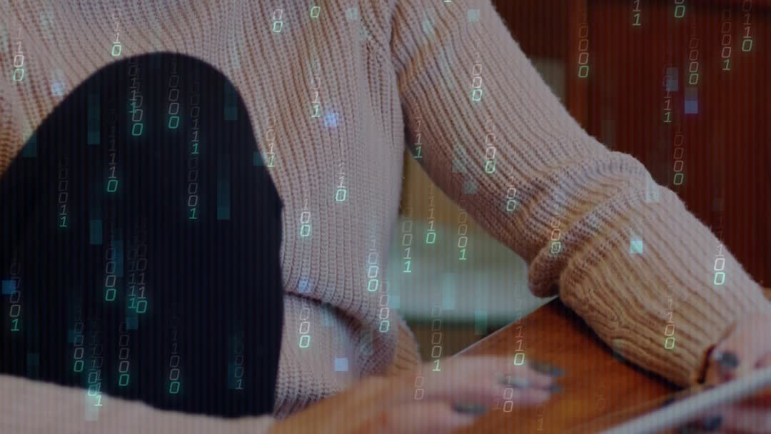 Clip showing woman placing tablet on wooden table and tapping screen while binary code overlay is streaming across frame, conveying themes of cybersecurity, coding, and digital communication. Featuring warm tones, cozy sweater texture, shallow depth of field, smooth downward camera movement keeping focus on hands and device. Footage fitting for tech tutorials, cybersecurity explainers, remote work promos, e-learning courses, app demos, corporate presentations, and social media ads. Suggested uses involving adding animated titles, lower thirds, voiceover for product demos; looping short segments for website hero backgrounds; cutting into interviews or explainer videos as illustrative B-roll; using as opener for tech branding videos.