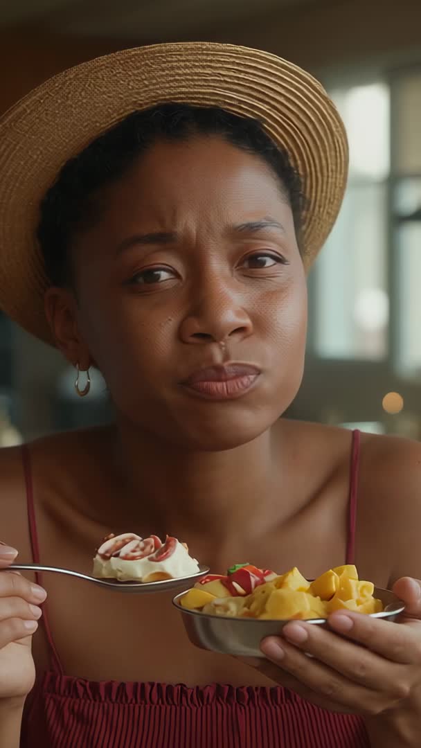 AI Generated Image. Featuring close-up portrait of woman tasting gourmet fruit yogurt while glancing left, wearing straw hat and hoop earring. Capturing spontaneous bite reaction and subtle facial expression conveying curiosity and enjoyment. Highlighting colorful composition with mango cubes, berries, fig slices and creamy yogurt in stainless bowl, spoon movement adding dynamic motion perfect for vertical framing. Ideal for food and beverage content, wellness and healthy eating campaigns, lifestyle reels, cooking tutorials, cafe or restaurant promos, social media ads and recipe videos. Suggesting use as hero clip for TikTok or Instagram Reels, banner for mobile ads, product demo insert or stock footage for cooking show. Recommending color grading toward warm tones, adding soft ambient music and short captions for higher engagement. Licensing available for commercial use.