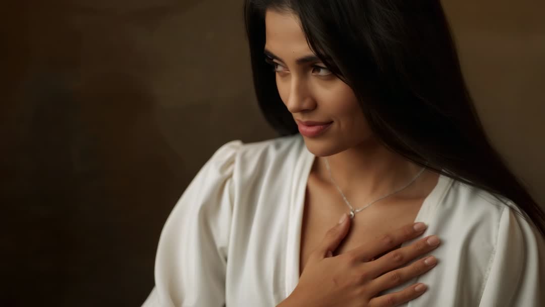 AI Generated Image. Close-up video clip showing woman touching pendant, cradling chest, lifting gaze to side while wearing white blouse. Soft warm lighting and shallow depth of field creating intimate, cinematic mood. Composition focusing on face, hand, necklace, allowing clean crop for banner, social post, or editorial use. Clip fitting well for jewelry advertising, lifestyle campaigns, mindfulness and self-care content, romance or bridal storytelling, fashion lookbook, and brand marketing wanting warm human touch. Color palette showing warm brown background with neutral clothing, allowing easy color grading and text overlay. Suggested uses: website hero video, social media reel, product demo for necklace, blog header for personal growth article, commercial spot for online ad. Model release recommended for commercial use.