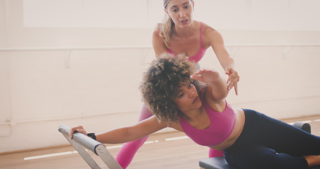 Women in bright attire engaged in Pilates on reformer machine. Trainer providing focused guidance to enhance client's posture and workout effectiveness. Ideal for fitness blogs, Pilates studios, workout apparel advertisements, health magazine features discussing the benefits of guided exercises, or promotion of personal training services.