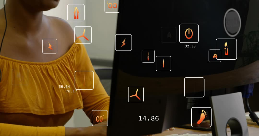 This video features a woman wearing a yellow blouse and a headset, actively engaging with interactive energy icons and metrics displayed on a computer screen. The digital interface suggests a modern approach to monitoring environmental data such as CO2 levels, emphasizing innovation and sustainability. Ideal for use in corporate settings related to technology, energy management, environmental analytics, and workspace productivity enhancement. It visually communicates the concept of integrated data solutions and effective information analysis.