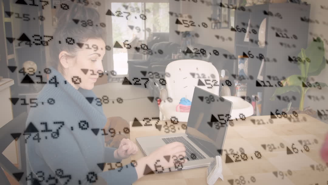 A woman sits at a table using a laptop, emphasized by an overlay of dynamic stock market data. This video represents the digital economy and how technology integrates with home-bound work practices. Useful for illustrating themes of finance and remote work.