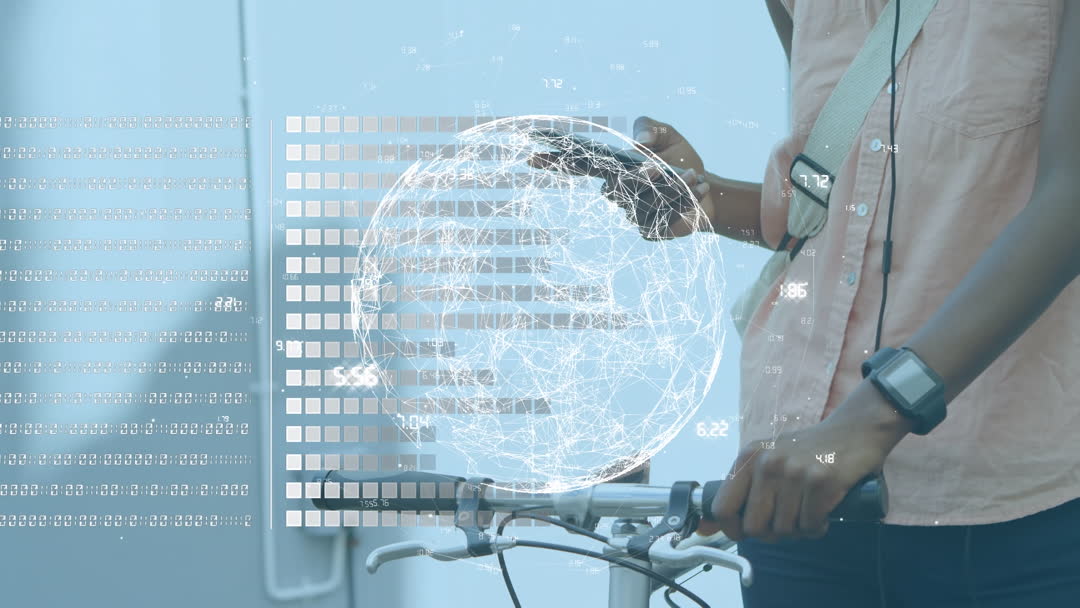 A woman interacts with her smartphone while a globe with network lines visually presents global connections and data. She holds a bike, symbolizing eco-friendly travel, and wears a smartwatch, further emphasizing modern technology. This concept represents interconnectedness in a digital world, suitable for articles on technology advancements, sustainable transport, or global communication trends.