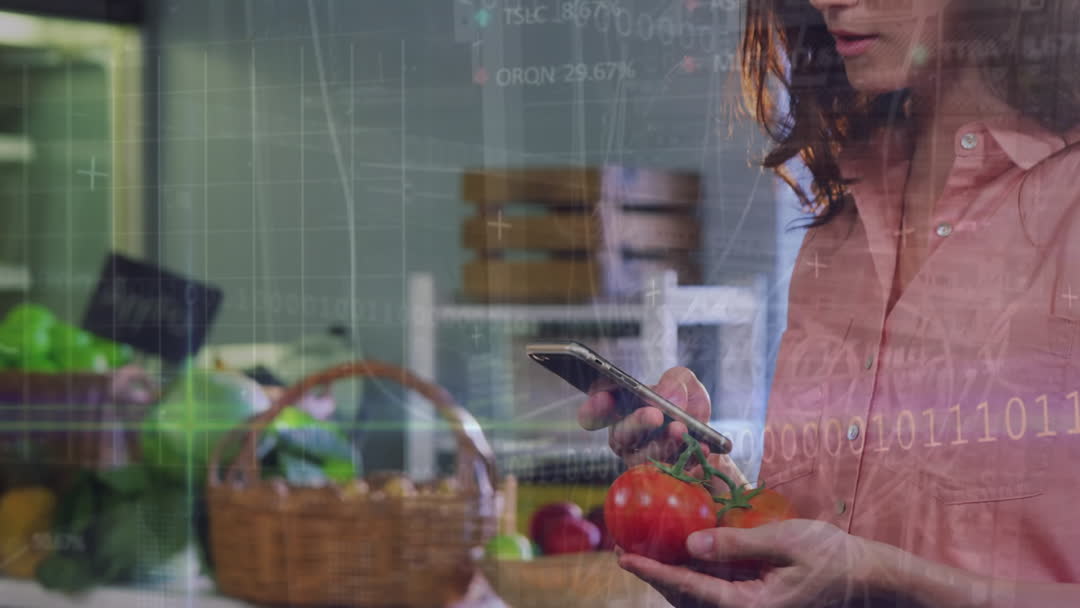 Woman Using Smartphone in Produce Shopping Overlaid with Financial Data Video