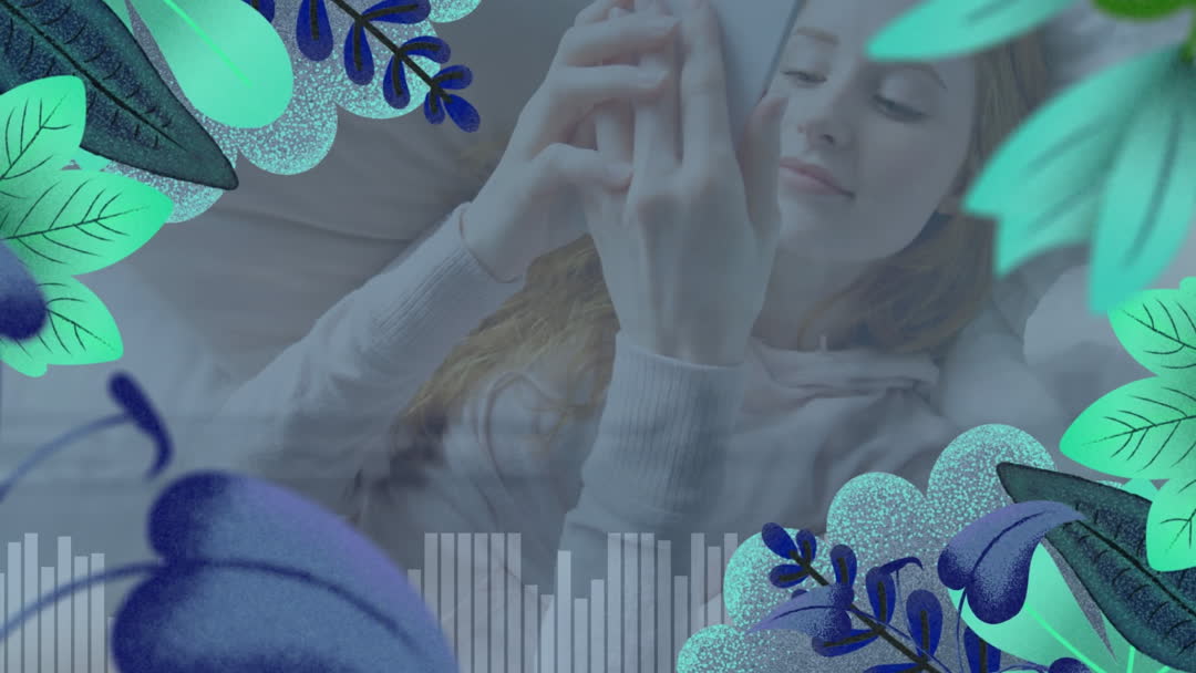 Young woman lying on bed, smiling and using smartphone, surrounded by vibrant, cartoonish leaves and a dynamic music equalizer bar. Perfect for themes on personal relaxation, technology usage at home, and integration of tech in daily leisure activities. Suitable for lifestyle blogs, relaxation apps, or tech-savvy demographics emphasizing modern living.