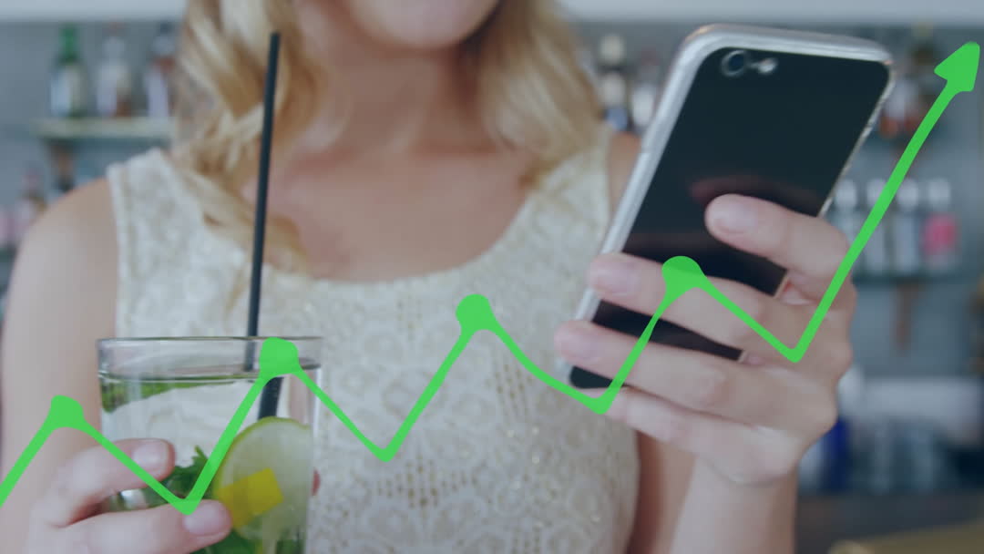 Woman Using Smartphone with Bar Chart Overlay Video