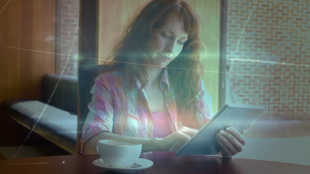 Caucasian woman is using a digital tablet while sitting in a contemporary cafe. There is overlay of network connections, hinting at global networking and business technology concepts. Ideal for illustrating concepts like remote work, digital connectivity, modern lifestyle, and coffee culture.