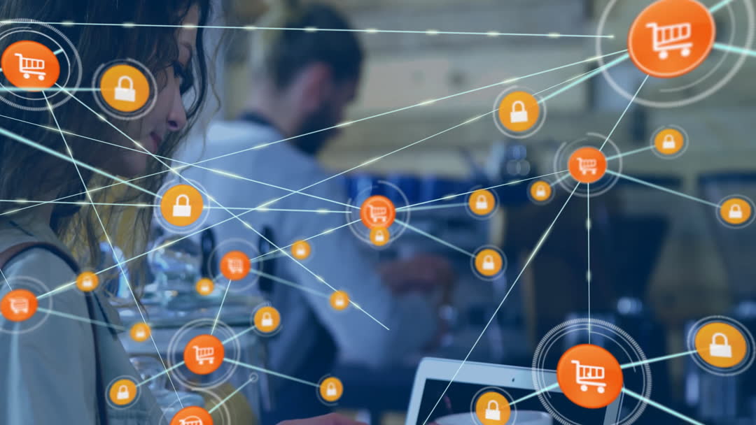 A woman explores online shopping options on a tablet in a relaxed cafe setting, with cart symbols and network connections visually represented over the scene. This videory conveys themes of digital commerce, online connectivity, and secure transactions. Perfect for highlighting internet usage, modern consumer behavior, or promoting digital products and services online.