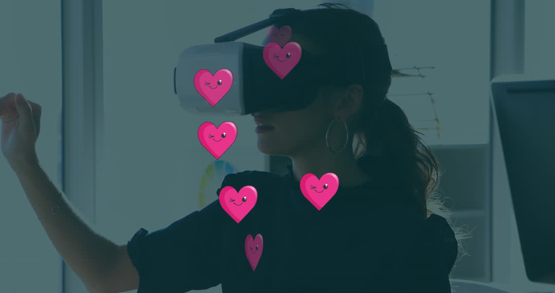 Woman experiencing virtual reality through a VR headset, with pink smiley heart icons representing social media interactions. Useful for showcasing the intersection of technology and social media. Ideal for innovations in virtual communication and digital connectivity contexts.