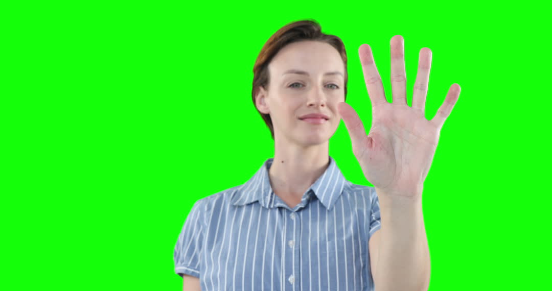 - Woman Using Virtual Screen with Hand on Green Screen Background