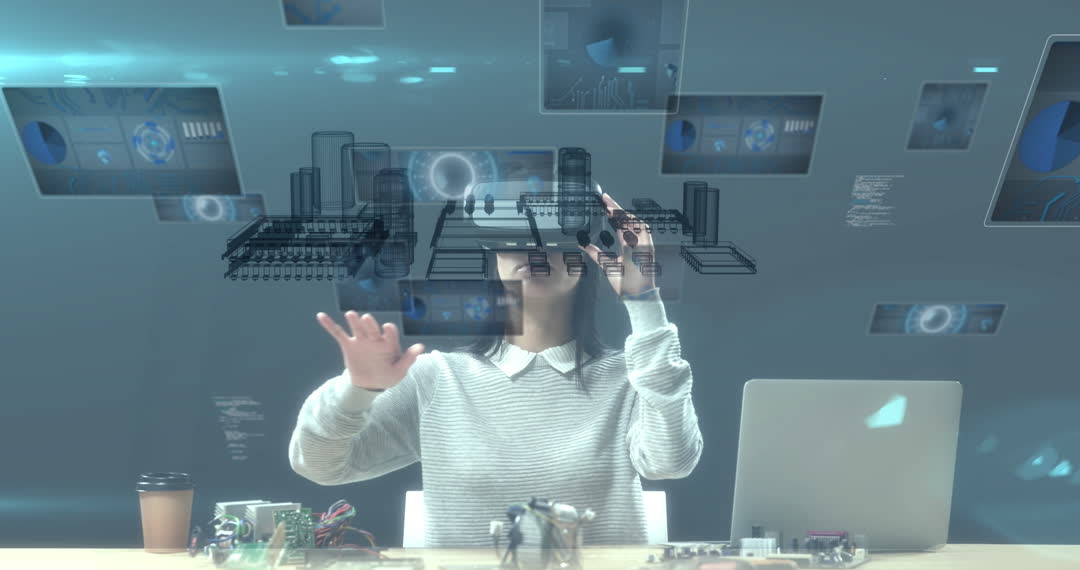 Woman Utilizing VR Headset for Interactive Data Processing Video