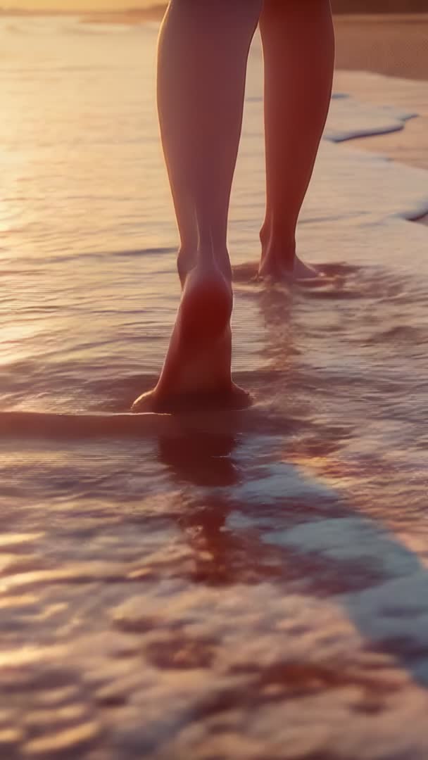 AI Generated Video. Showing close-up vertical footage of woman walking barefoot along wet sand during golden hour, with gentle waves lapping and warm sunlight creating long reflections on water. Camera following lower legs and feet, conveying intimate, calming mood while emphasizing sand texture and motion of foam. Color palette featuring soft gold and pastel tones, lens capturing shallow depth of field and rhythmic water movement. Usage ideas: Use as vertical reel for travel and lifestyle channels, background clip for wellness and mindfulness apps, hero footage for beach resort or tourism ads, B-roll for skincare or footwear campaigns, calming loop for meditation or relaxation videos, header visual for blog posts about sunset walks, romance stories, or seasonal summer promotions. Suitable for slow-motion edits, overlay text, motivational quotes, and mobile-first storytelling.