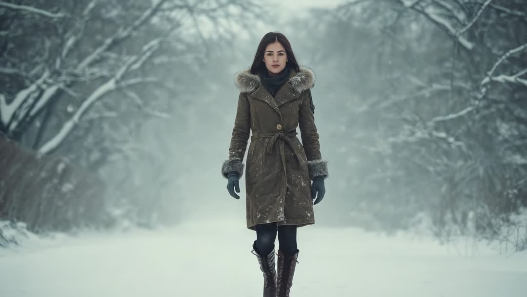 - Woman Walking Through Peaceful Snowy Forest Path in Winter
