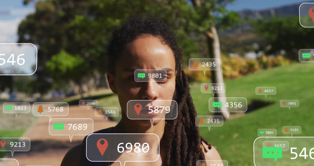 This video captures a woman walking in a park while augmented reality graphics show various social media notifications and locations pulsing around her. Perfect for illustrating themes related to digital connectivity, the influence of social networks, or futuristic technological interfaces in everyday life.