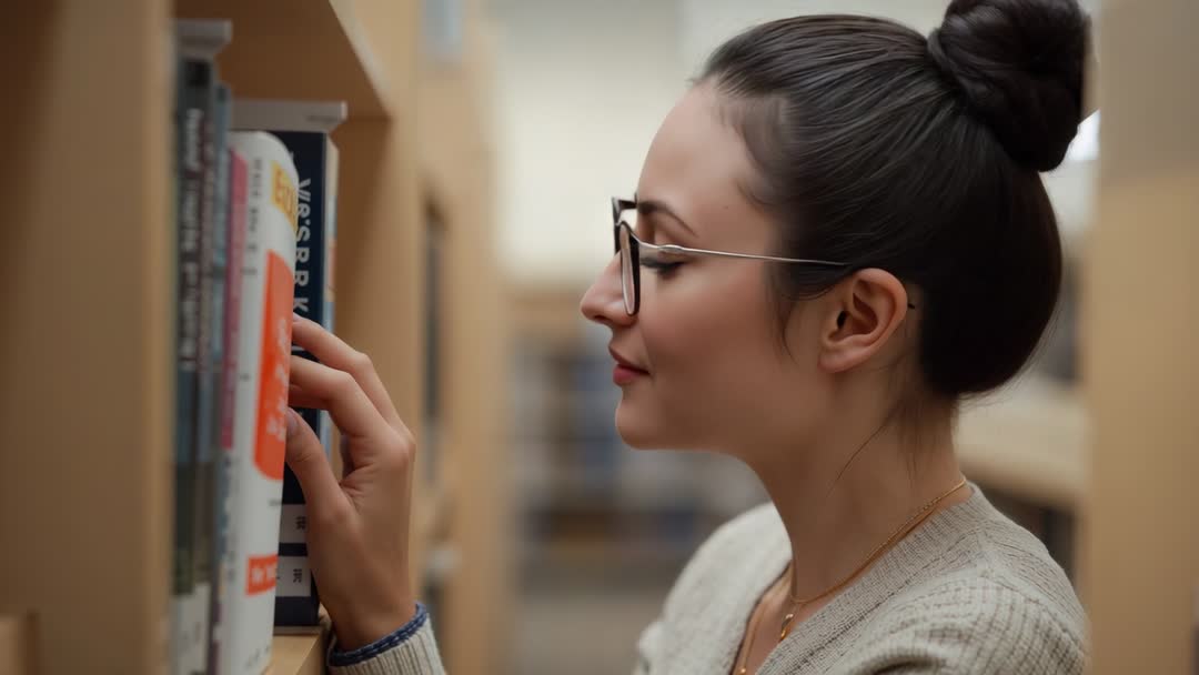 - Woman wearing glasses browsing library shelves, selecting book from wooden aisle, calm study clip