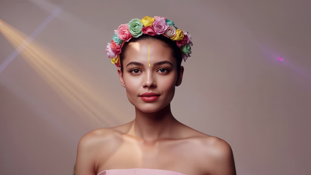 AI Generated Video. Captures elegance and beauty of a woman adorned with a colorful floral crown and gold line on her forehead. Gentle shifting beams of light create an ethereal atmosphere, highlighting features of the subject. Suitable for themes related to beauty and fashion, art photography, or as visual inspiration for tranquility and elegance.